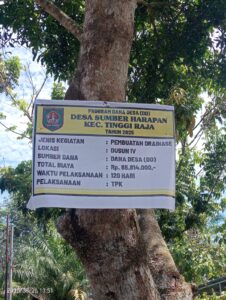 SUMUT _ Bedahkasusmntv.com – Program Dana Desa (DD) tahun 2025 di Desa Sumber Harapan, Kecamatan Tinggi Raja, kembali menuai sorotan tajam dari masyarakat. Proyek pembuatan drainase di Dusun IV yang menelan anggaran Rp 65.814.000 dinilai janggal karena tidak mencantumkan secara jelas panjang, lebar, maupun volume pekerjaan pada papan informasi proyek.