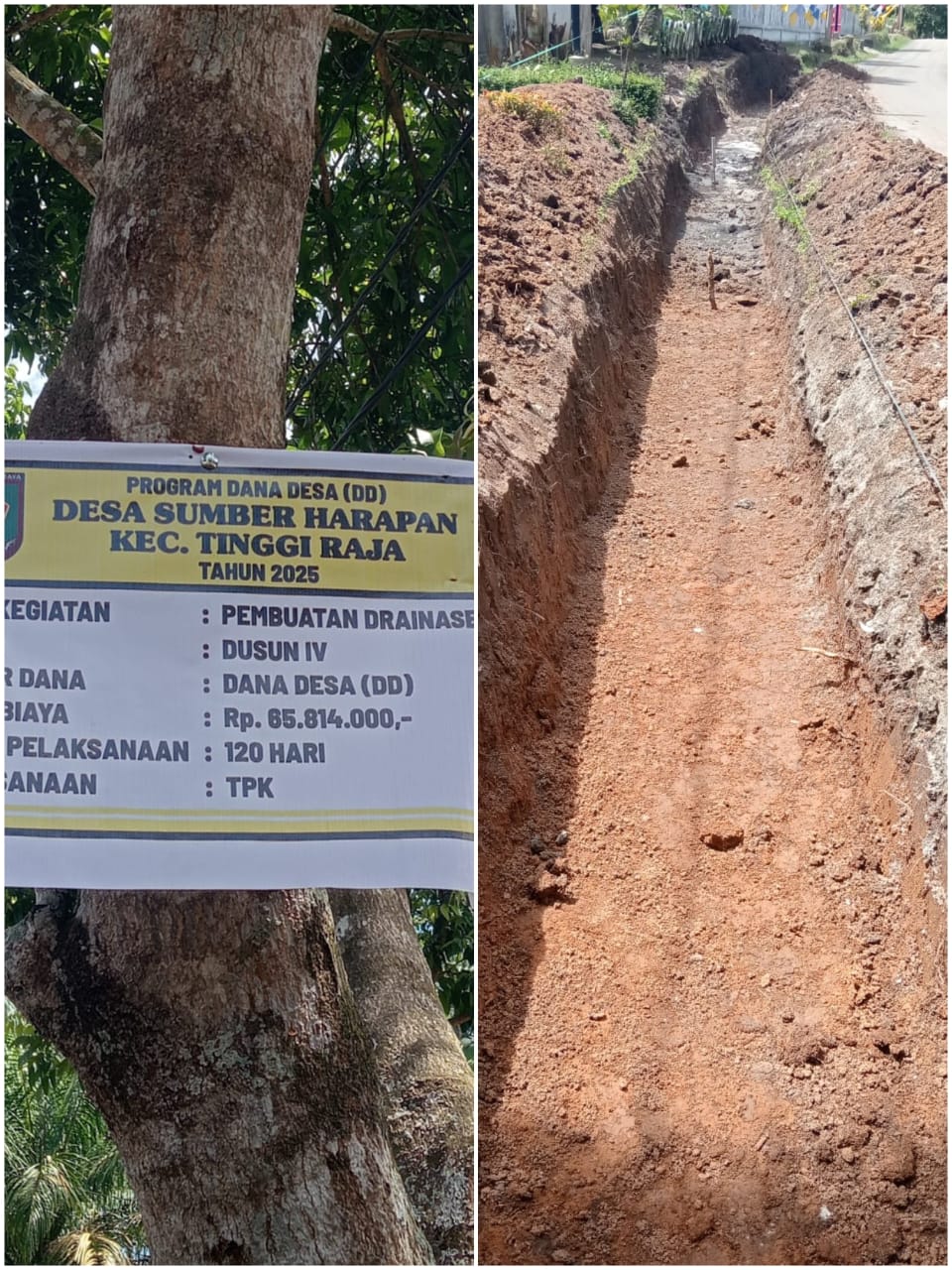SUMUT _ Bedahkasusmntv.com – Program Dana Desa (DD) tahun 2025 di Desa Sumber Harapan, Kecamatan Tinggi Raja, kembali menuai sorotan tajam dari masyarakat. Proyek pembuatan drainase di Dusun IV yang menelan anggaran Rp 65.814.000 dinilai janggal karena tidak mencantumkan secara jelas panjang, lebar, maupun volume pekerjaan pada papan informasi proyek.